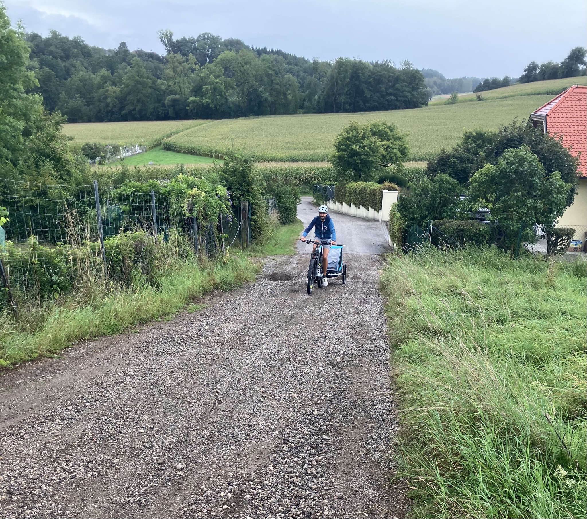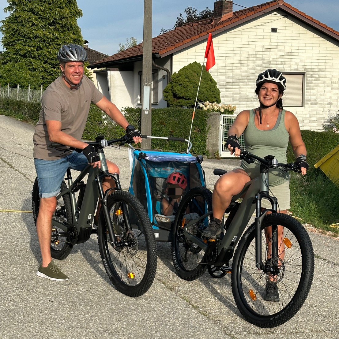 „Wir haben uns wirklich sehr gefreut, als wir erfahren haben, dass wir den tollen Fahrradanhänger testen dürfen. Zuerst mussten wir jedoch noch ein zusätzliches Fahrradteil bestellen, damit wir ihn auch mit unseren Rädern nutzen konnten. Von da an war er jede Woche im Einsatz, ob bei Regen oder Sonnenschein, wir konnten ihn wirklich super im Alltag integrieren. Sei es in den Kindergarten, zum Bäcker in Schleißheim, zum Spielplatz nach Thalheim, nach Schleißheim zu den Schweinen, auf Besuch zu Oma und Opa in Weisskirchen, zum Kinderschwimmen nach Schicklberg, oder den Vorteil keinen Parkplatz am Welser Volksfest zu suchen. Die anfängliche Skepsis meinerseits, bei unseren ganzen hügeligen Feldwegen war komplett unbegründet, der Anhänger sieht nicht nur toll aus (die Lieblingsfarbe unseres Sohnes), sondern er lässt sich auch sehr leicht führen und scheint auch bequem zu sein. Luca schlief sogar meist bei längeren Ausflügen ein und wollte gar nicht mehr mit unserem normalen Aufsatz fahren. Wir bedanken uns noch einmal sehr für die Möglichkeit und vielleicht haben wir ja das große Glück bei der Verlosung und dürfen ihn auch in der Zukunft für viele weitere Erlebnisse verwenden.“