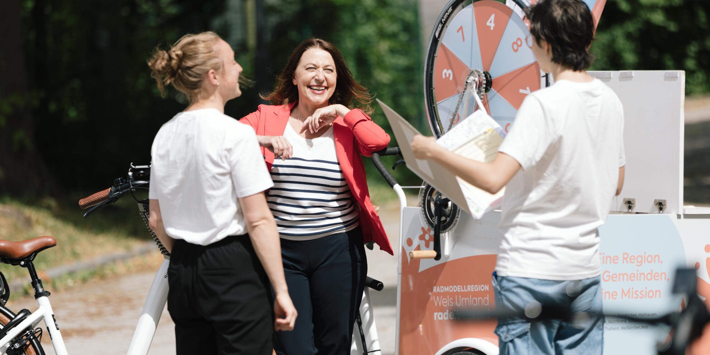 Das Promotionrad ist mit einem Glücksrad ausgestattet, das zum Gewinnspiel einlädt. Veranstaltungsbesucher:innen können ihr Wissen über das Radfahren in der Region beweisen und tolle Radpreise gewinnen.