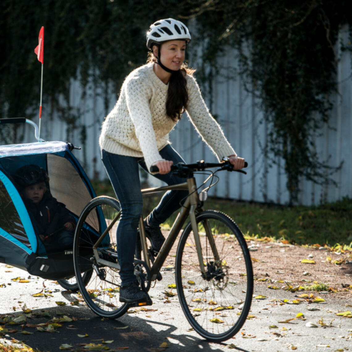 Familien können Kinderradanhänger 10 Wochen lang für Alltagswege testen. Und mit etwas Glück im Herb…